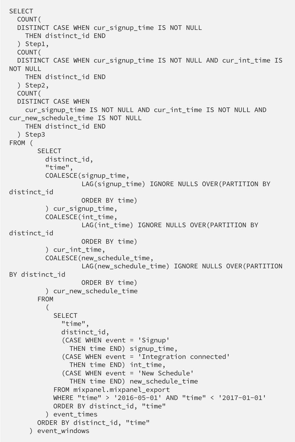 And yes, I could do this with SQL as well - but to be honest, I can spend my time far better - this is a usual SQL query for just a simple funnel analysis: