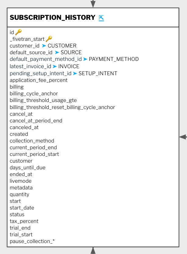 Fivetran, for example, uses history tables for some integrations. History tables are a great start to finding event data since they materialize the activities' results. Here we have a subscription history table: