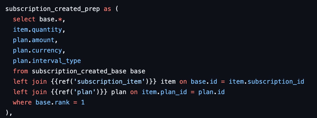 In the next step, we get more context information by joining subscription_item and plan tables. We can use this context later to calculate the MRR and break it down according to the different plans. Here, we also make sure to pick only the first item.