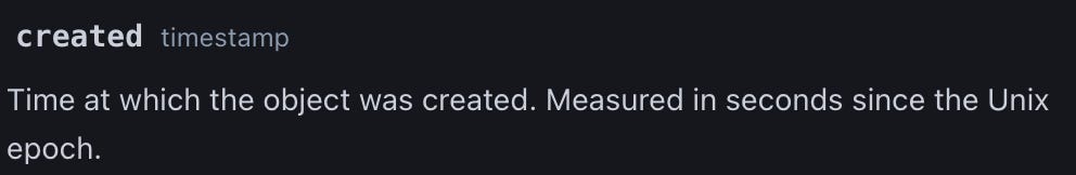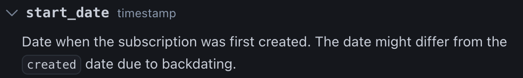Looking at the subscription history table, I can find the `start_date` and `created` fields. That looks good. Now, we need to understand the difference. Luckily, Stripe has one of the best-documented APIs around: