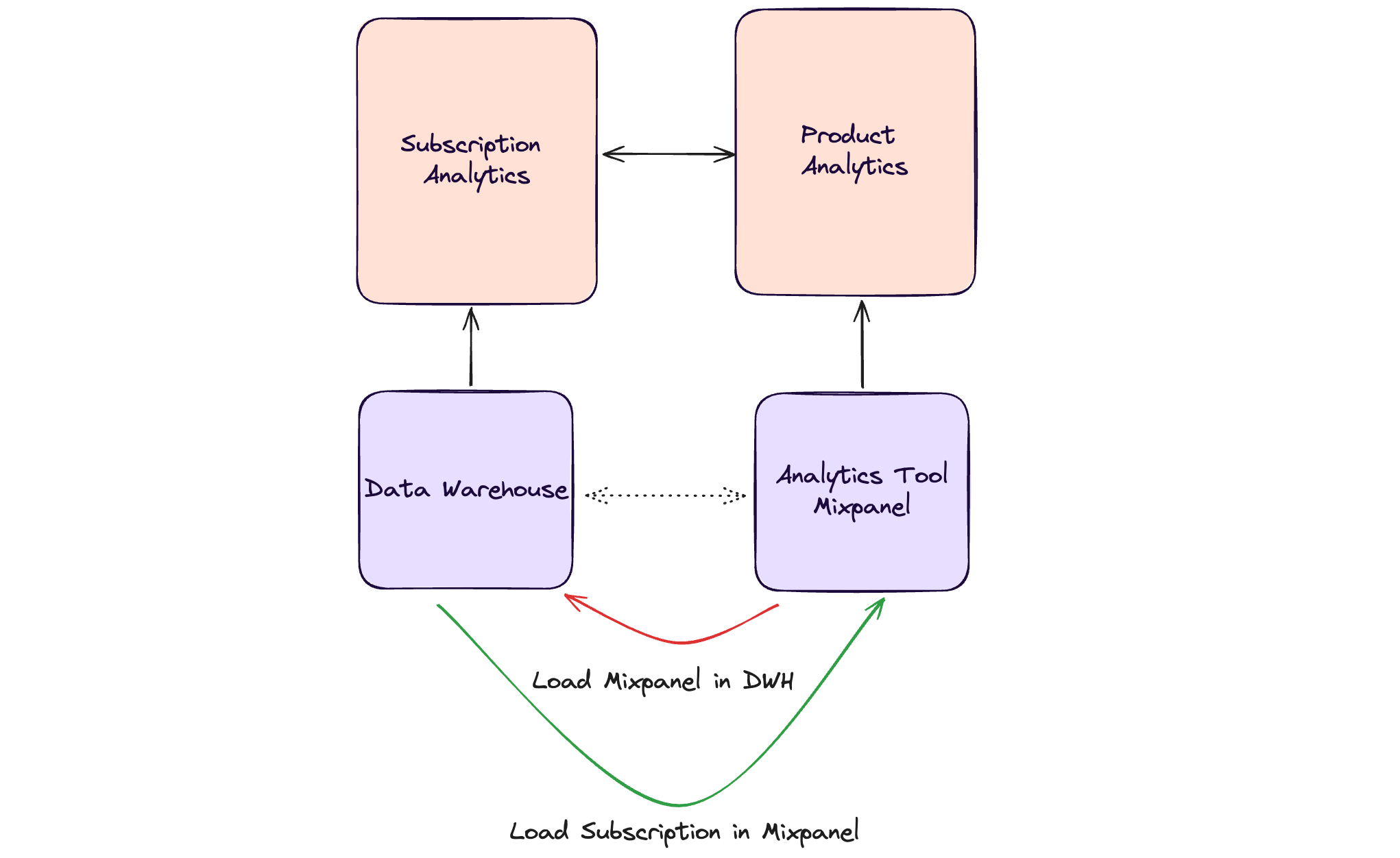 The behavioral data is already in Mixpanel. The subscription data is stored as snapshots in our data warehouse. Our task is to bring both of them together in Mixpanel. Why in Mixpanel? I explain in a second.