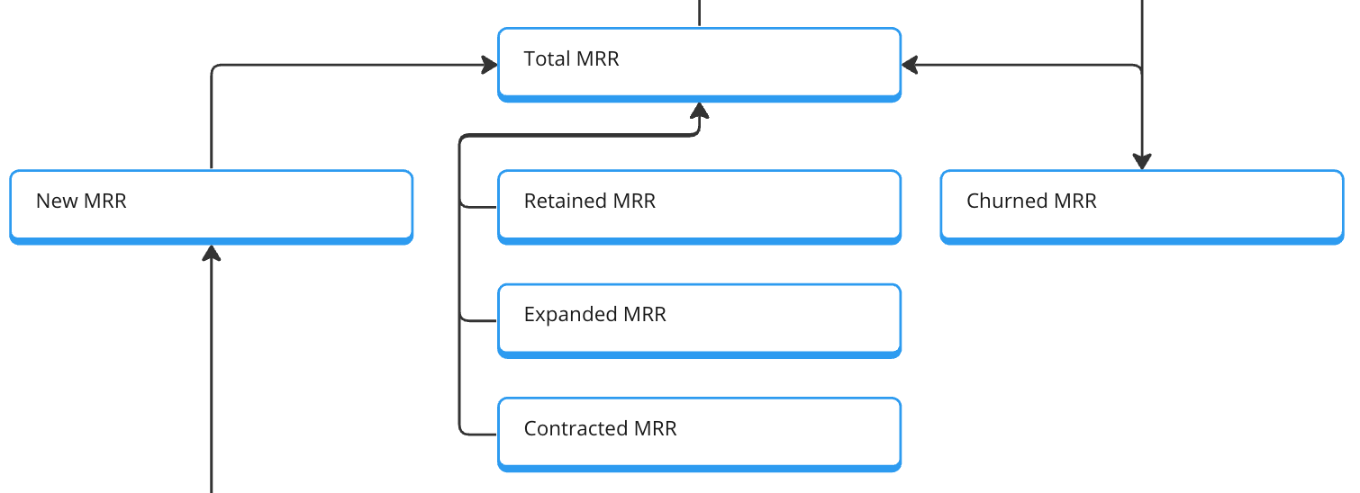 The subscription part is quite familiar; the details depend on the subscription model. We have the classic MRR bridge with total MRR as output metrics. Then, new MRR, expansion MRR, contraction MRR, retained MRR, and churned MRR are related metrics. These are then connected to the account metrics since we need an account to create a subscription.