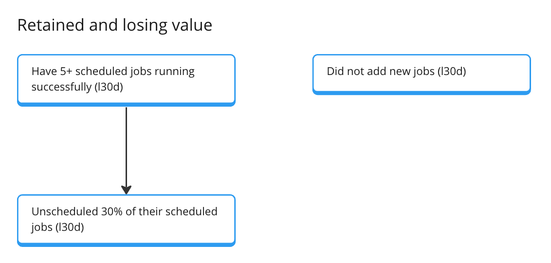 Have 5+ scheduled jobs running successfully (for l30d) - this can already become our "returning value" state. People who successfully run many scheduled jobs get value from the platform.