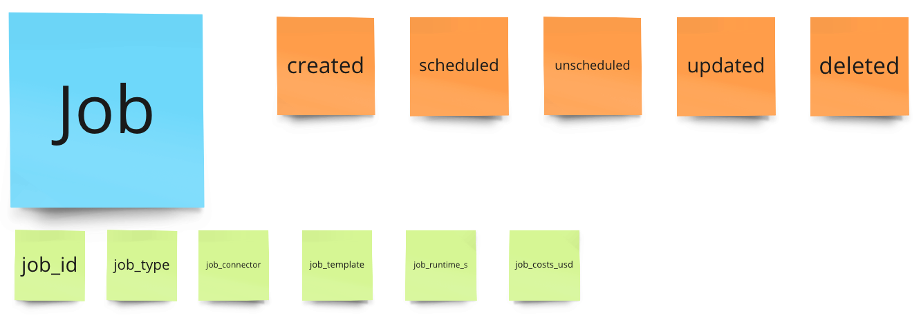 But the most crucial property is job_runtime, which we need to calculate the seconds used. And we also need the costs of a job for our clients -> job_costs. This might be something that we enrich later since these calculations are often batch jobs (to incorporate these crazy discounts that sales teams love to negotiate). To enable a later enrichment, we need "job_id".
