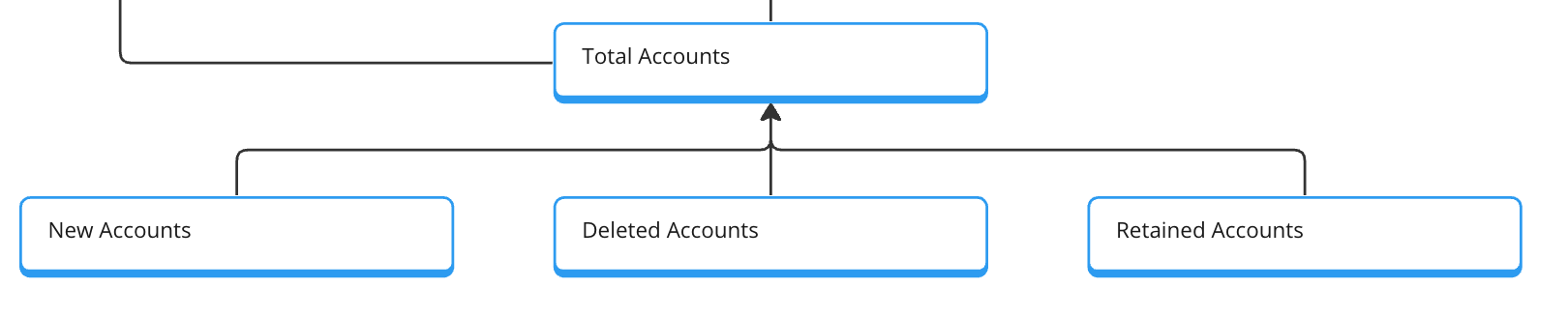 At the bottom of the first version, we have the account block. Here, we check for new, churned, and retained accounts. This is the essential baseline for our tree, from which we could also go deeper by linking marketing metrics to generate new accounts.