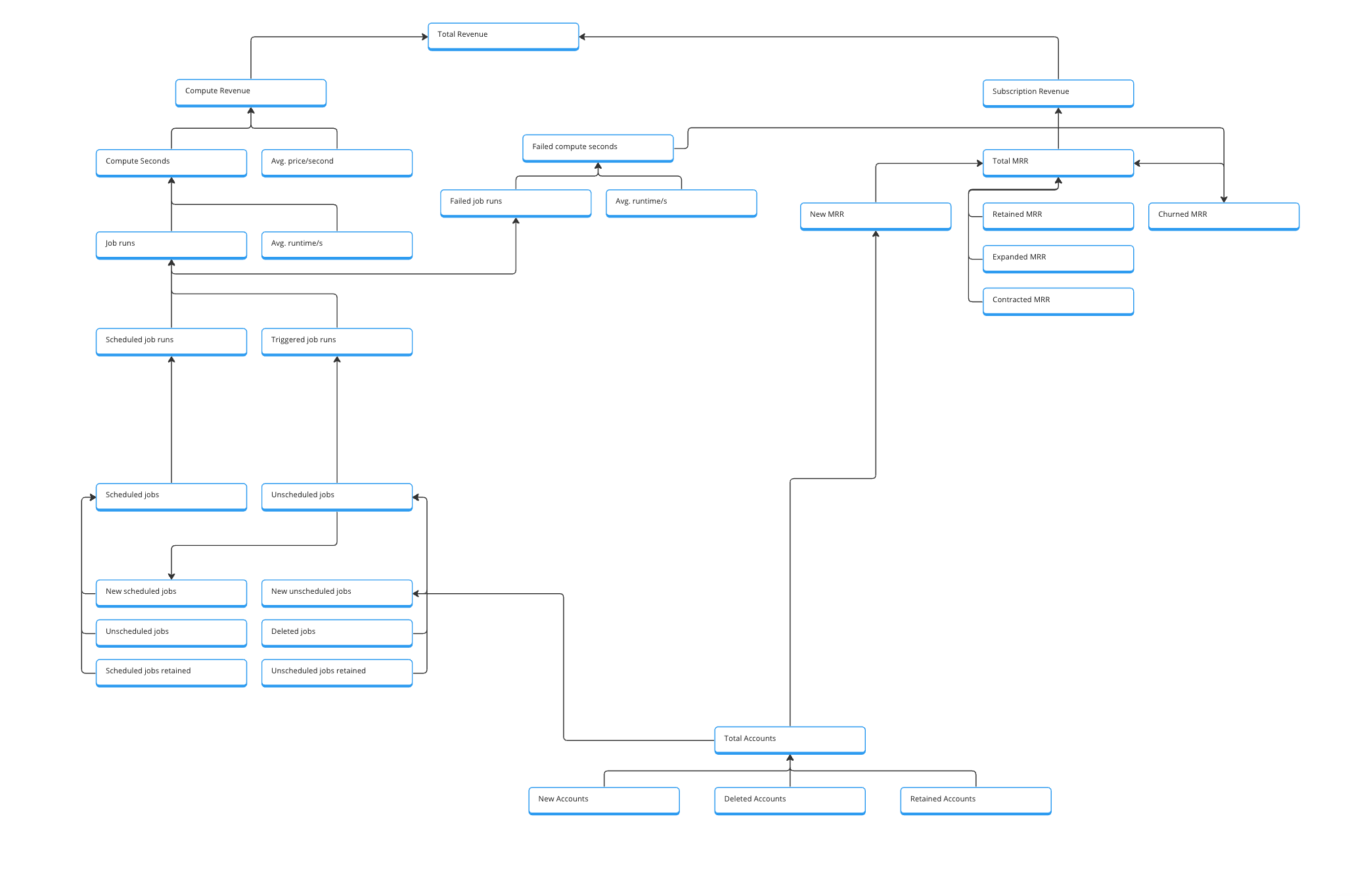 On the next level, we look at scheduled and triggered job runs. This is already a dimensional breakdown. We could also offer this as a filter option in our BI tool. But I like to break it out here already since this information is helpful for product and customer success to enable more scheduled runs, which have a more positive impact on the computed seconds and are also a good indicator for a received value and trust in the platform.
