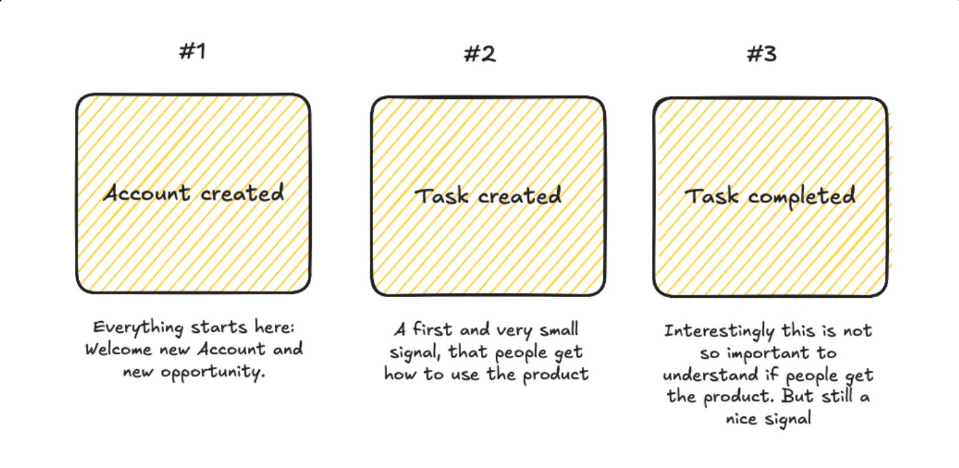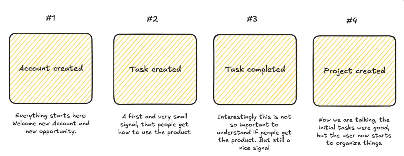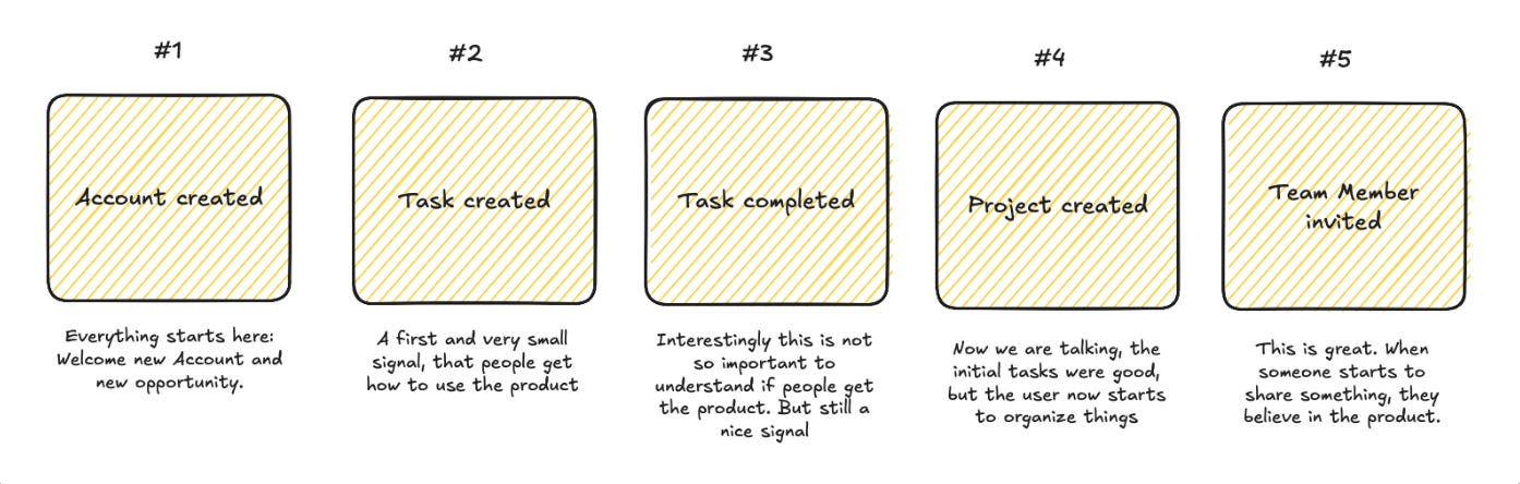 Let's take a task management tool. New ones pop up weekly – it's a crowded market. The wrong approach would be tracking every possible interaction in the tool. That just gives us a pile of data that doesn't tell us if we're actually making an impact or building the loyal user base we need (especially since people hop between task management tools every couple months).