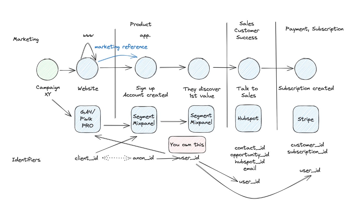 Eventually, I had to completely rethink my approach to product and marketing analytics. The realization hit me: tracking how users interact with my applications only tells me... how users interact with my applications. But the questions from product, marketing, and business teams are usually much bigger: Is our product successful? Are our marketing campaigns working? Is our business growing?