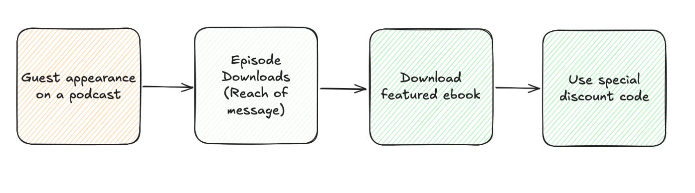 Consider podcast appearances. We might put our company leaders on different podcasts to boost visibility. Here, we need different success metrics. We might ask podcasts about download numbers to measure reach. Or we could get creative – maybe offer a special discount code for listeners, or create a podcast-exclusive ebook, then track how many people use that code or download that resource. The key is deciding upfront what success looks like.