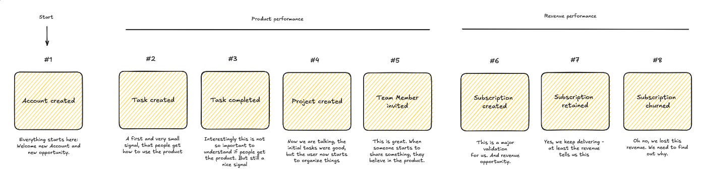 For all this, we just need eight events: account created, task created, task completed (optional), project created, team member invited, subscription created, subscription retained, and subscription churned. Let me show you how to use these to measure product performance.