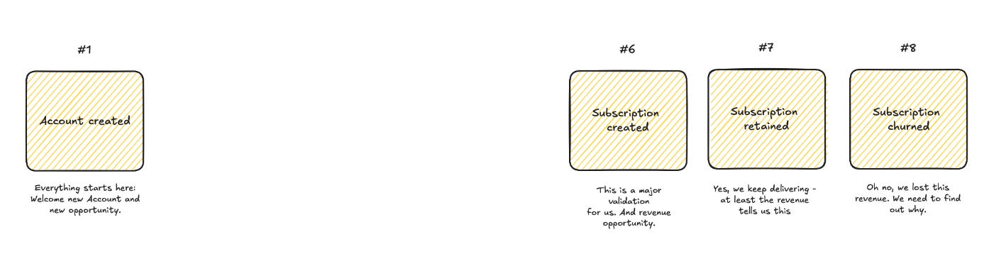 At the other end, we need "subscription created," "subscription retained," and "subscription churned." These three events tell us about our revenue health and let us calculate basic MRR metrics.