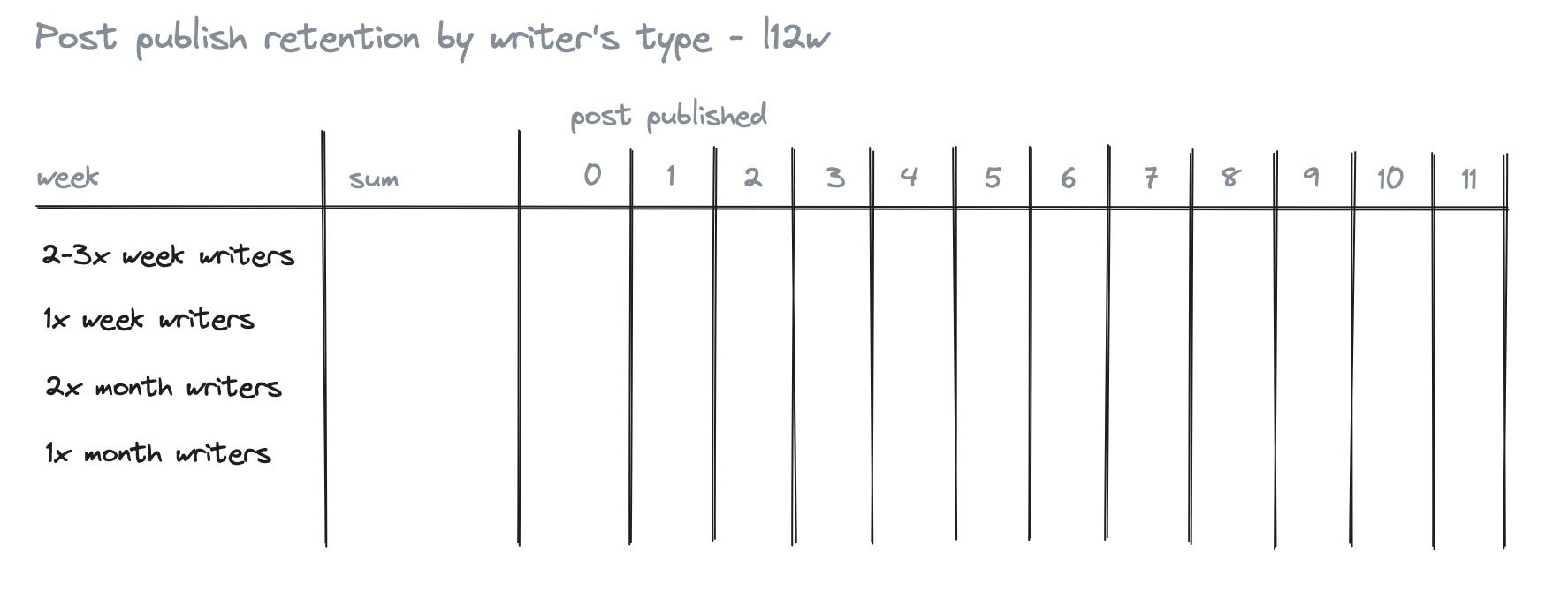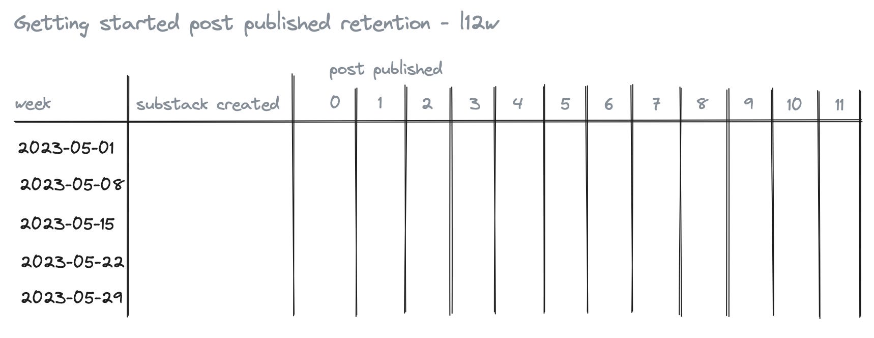 This one gives me data about how good we are at getting new Substacks to publish regularly. This is important for us to get new users into the publishing rhythm. The retention table helps me see how our initiatives are doing; we are deploying to activate new accounts right now.