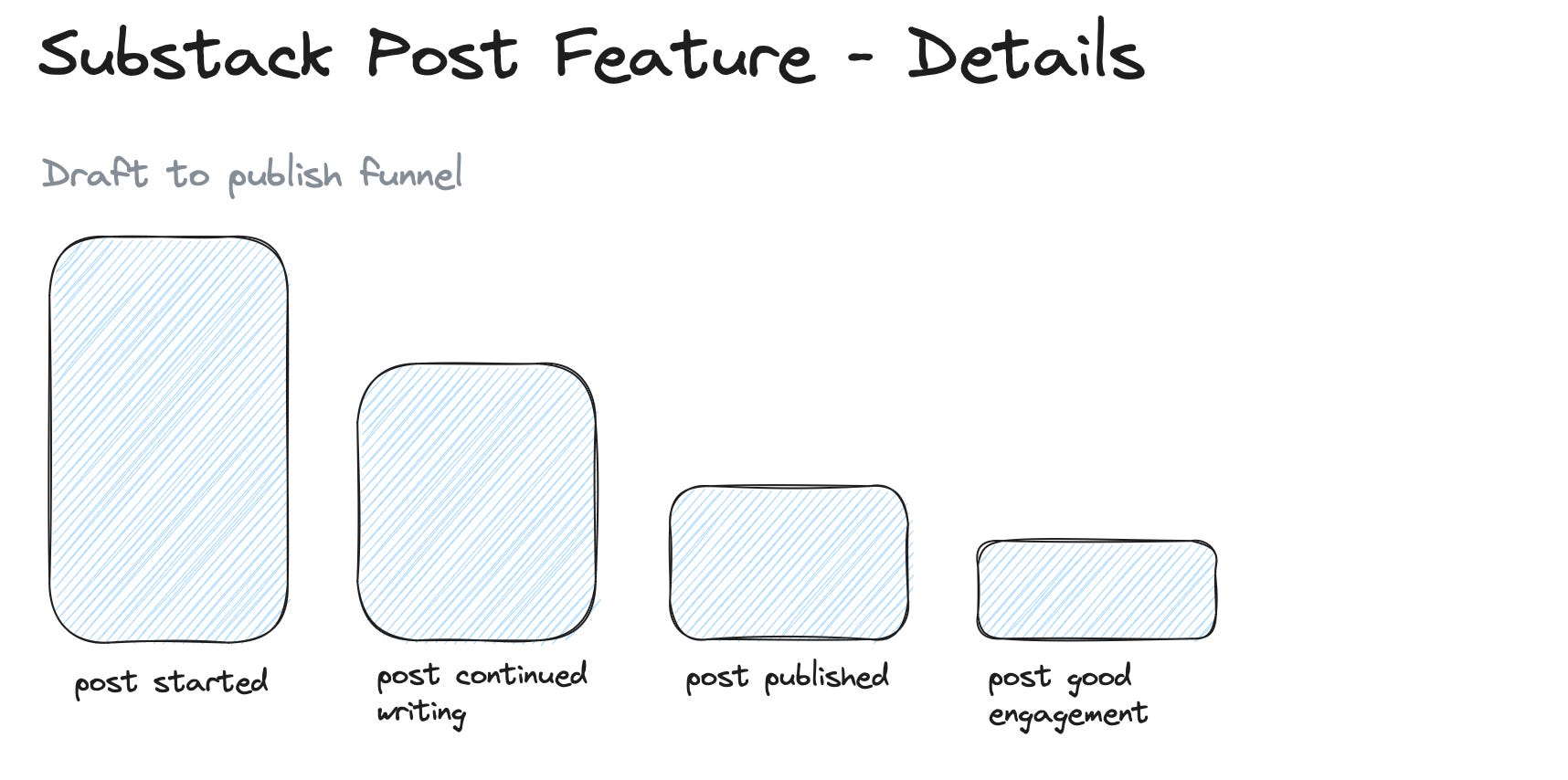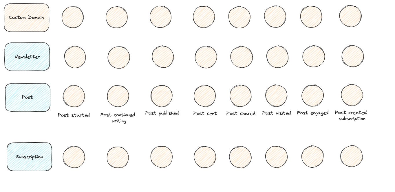 The activities describe a typical post lifetime, from getting started to generating another subscriber. Here for the posts, it’s also the core flywheel. The more posts your users create, the more you grow traffic and subscribers. So the core success activity here is: “Post published”; a secondary would be “Post created subscription”.