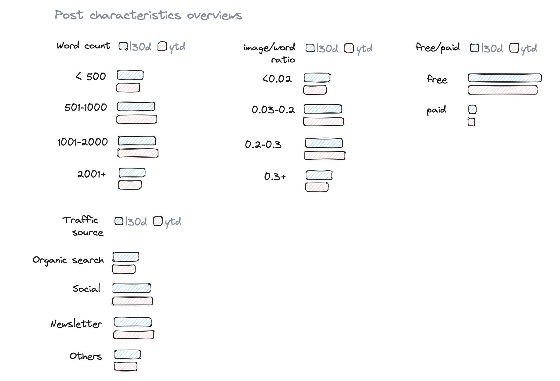 Finally, I like to add some criteria charts that show breakdowns of the product entity. This is helpful for all people working with the feature to understand how posts are split up.