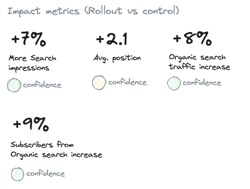 Here we need to see the impact the changes have on SEO traffic. Therefore we are comparing similar posts with the new features deployed vs. non-feature posts. And we are looking for increases in the feature-flagged posts over the old posts.